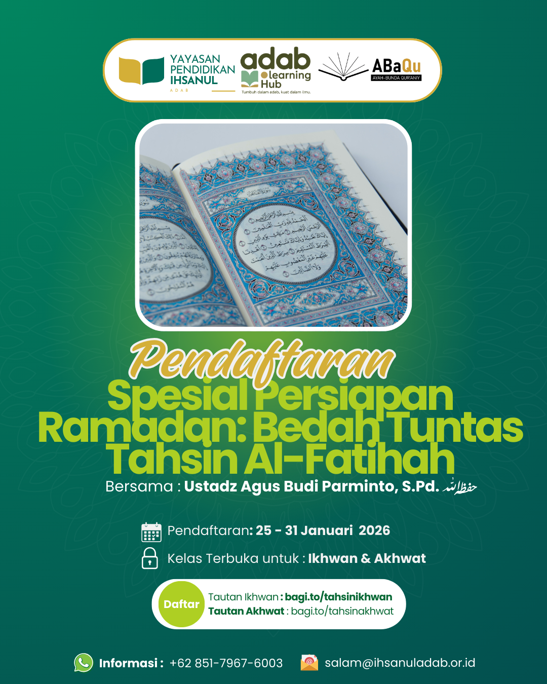 Yayasan Pendidikan Ihsanul Adab adalah lembaga pendidikan Islam berbasis manhaj Ahlus Sunnah wal Jama’ah yang dibangun dari keprihatinan akan lemahnya adab, kebingungan internalisasi ilmu, dan hilangnya ruang tumbuh yang aman bagi anak-anak dan keluarga Muslim di zaman ini.