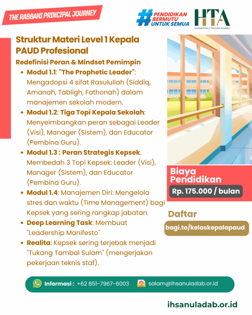 Saatnya melakukan transformasi. Mari bergabung dalam Program Kelas Online: Kepala Sekolah PAUD Profesional (Level 1). Program ini dirancang khusus untuk Calon Kepala Sekolah dan Kepala Sekolah PAUD yang ingin membangun fondasi kepemimpinan yang kokoh.