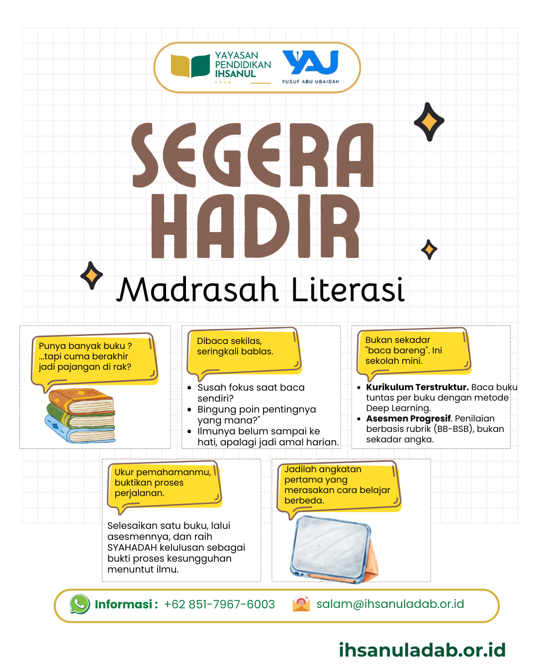 • Segera Hadir Madrasah Literasi: Kolaborasi Yayasan Ihsanul Adab dan Yayasan Yusuf Abu Ubaidah Hadirkan Metode Deep Learning dalam Membaca Buku